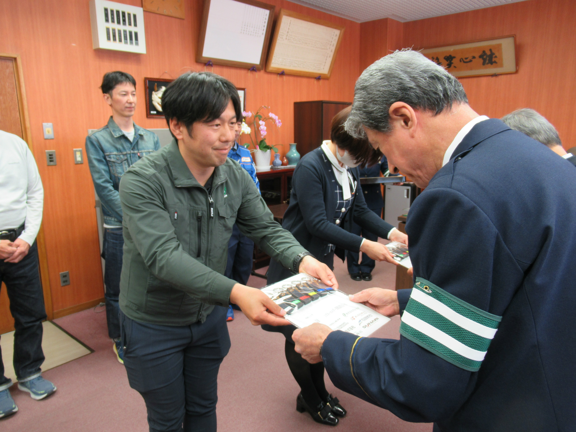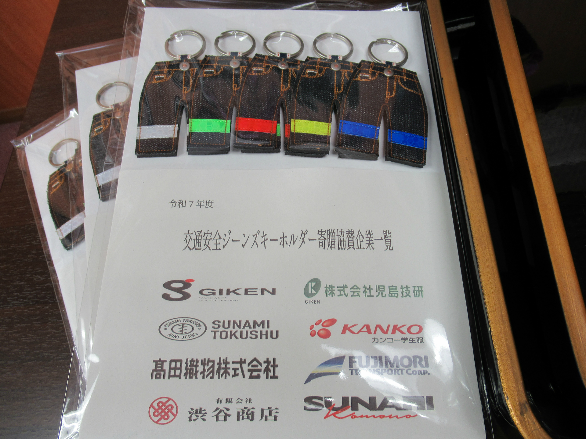 令和7年4月9日、本年度も藤森運輸をはじめとする児島地区で事業を展開する繊維業の各社と協賛し児島交通安全協会様へ交通安全の反射材付きお守りの寄贈を行いました。この反射材付きお守りは由加山蓮台寺でご祈祷していただいているもので、児島地区の小学校の新一年生に配布されます。