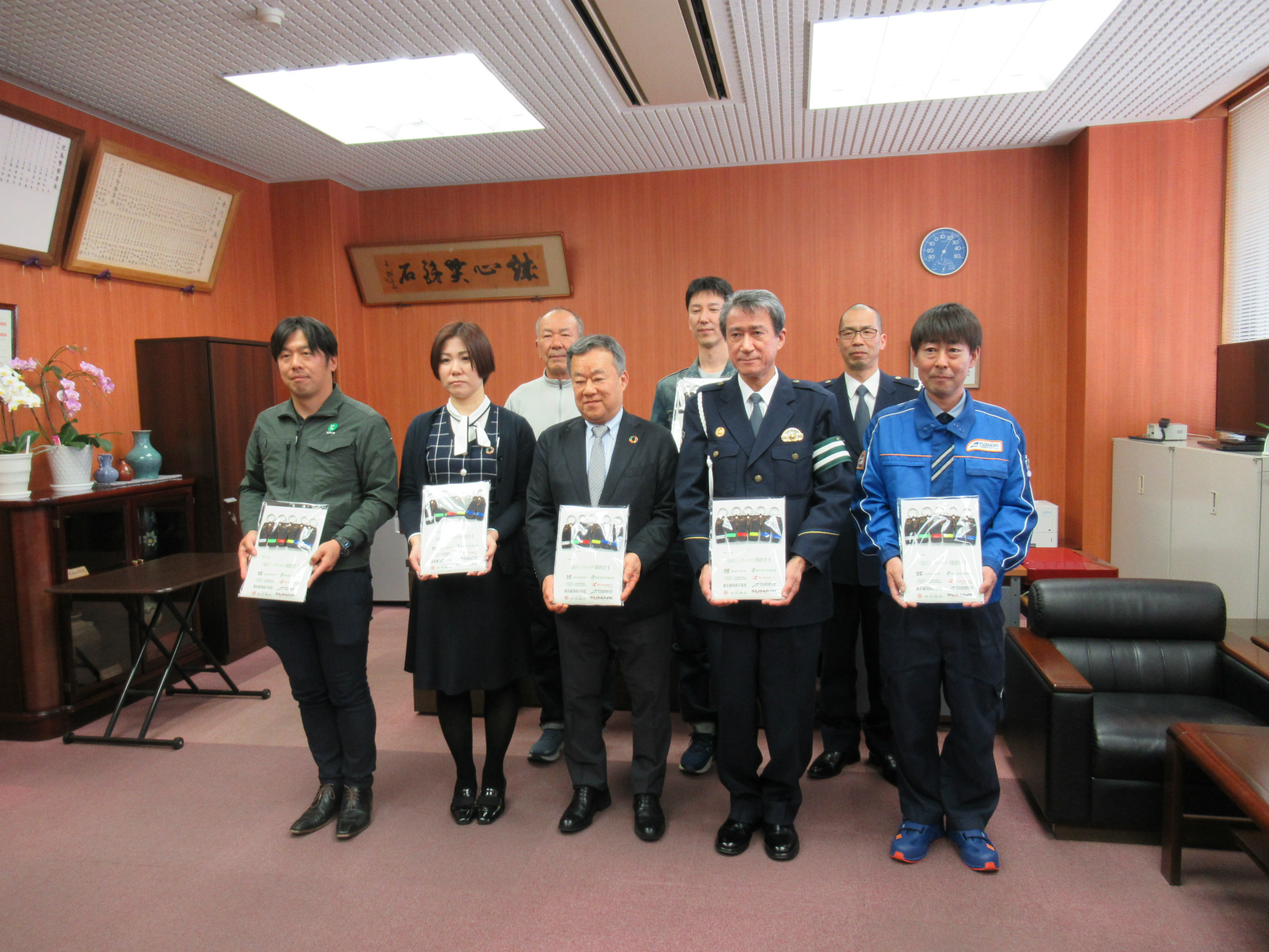 これは弊社が同協会の会長を努めさせていただいています縁で実施しているもので、早いもので本年で5回目になります。挨拶運動として、毎月登校する小学生に挨拶を行っていますが、最初にこのお守りを着けた児童の子たちは早5年生、高学年になり、まだまだ小さな1年生の立派なお兄さん、お姉さんになっており感慨深く見守らせていただいています。こういった成長を実感できる事に、このお守りの寄贈に意味があったなと感じさせられます。