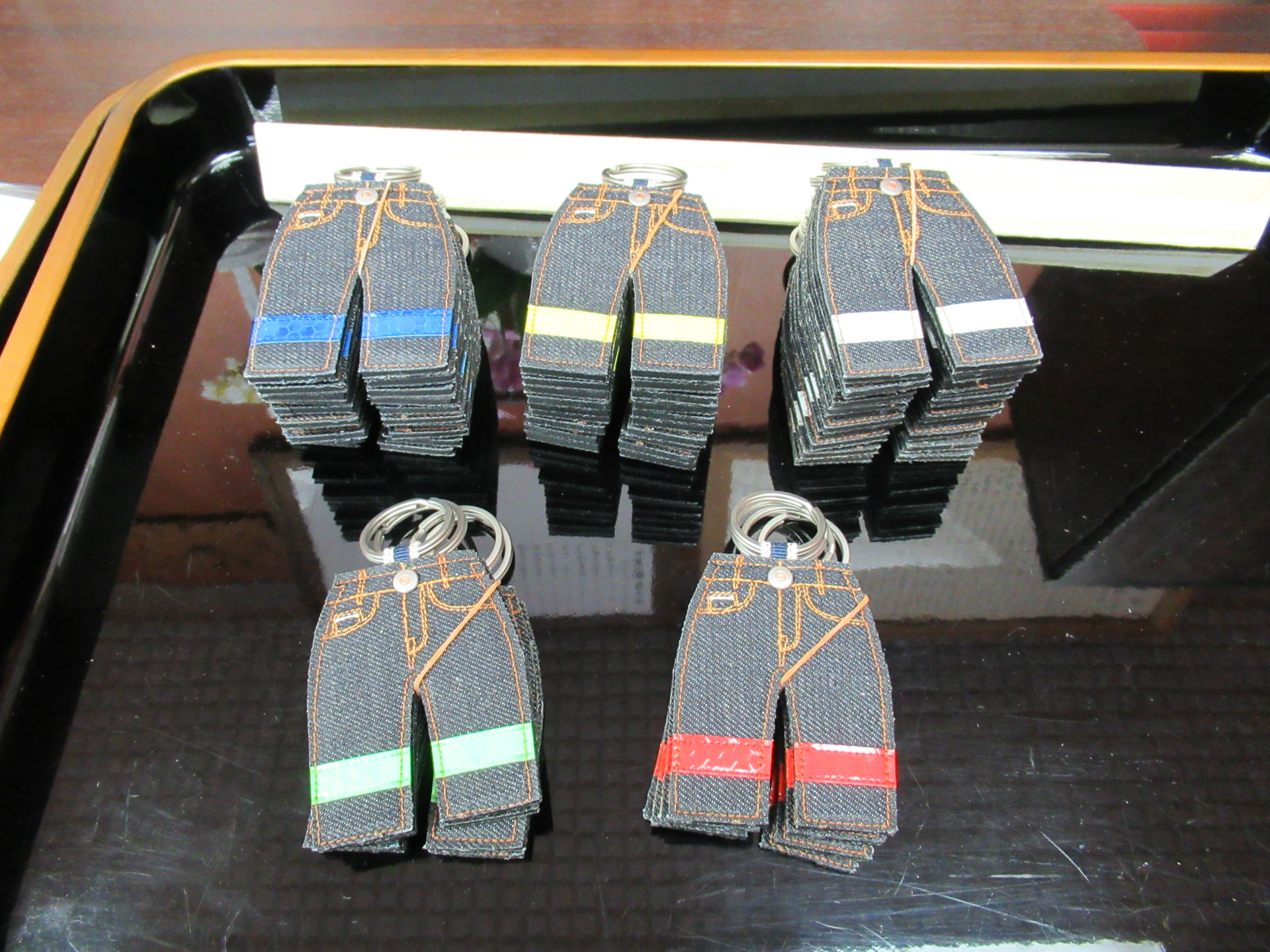 今回のお守りは、評判の良かった昨年と同様に5色で作成しております。交通安全協会様より各小学校に配布いただいていますが、教員方々にも児島のデニムとカラフルな反射材で評判が良く、お守りとして小学生の安全の一助となれば幸いです。この場を借りて協賛いただきました各社に感謝申し上げます。